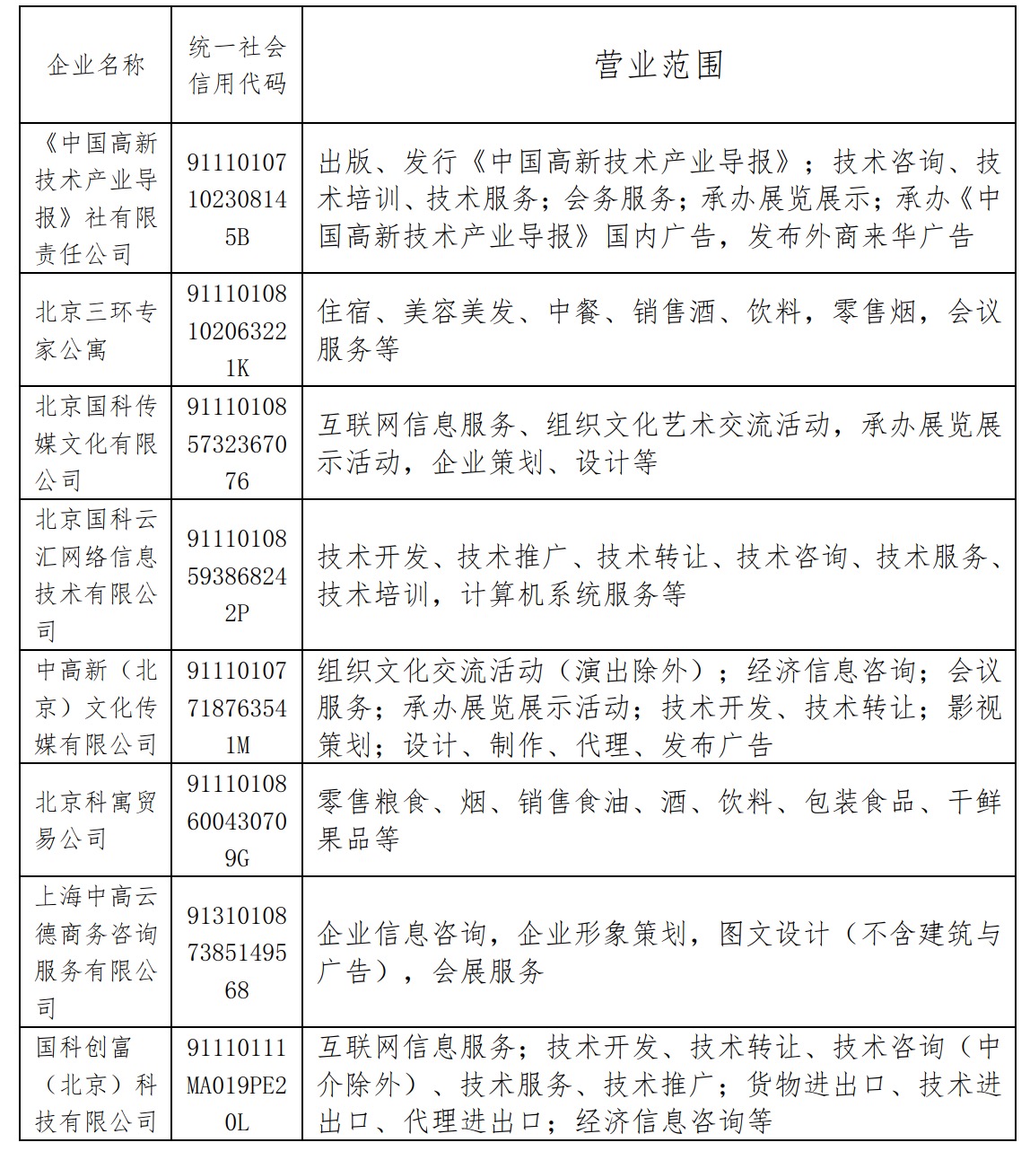 根据上级单位通知要求,科技日报社对已经登记注册的企业进行全面梳理,建立全级次企业名单,公布如下:
