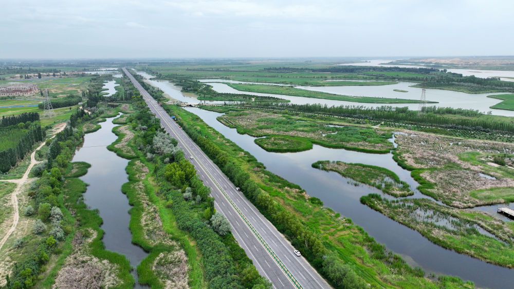 这是2024年6月13日拍摄的黄河宁夏段滨河大道(无人机照片)。近年来,宁夏努力建设黄河流域生态保护和高质量发展先行区,全力打好黄河保护持久战。新华社记者 王鹏 摄