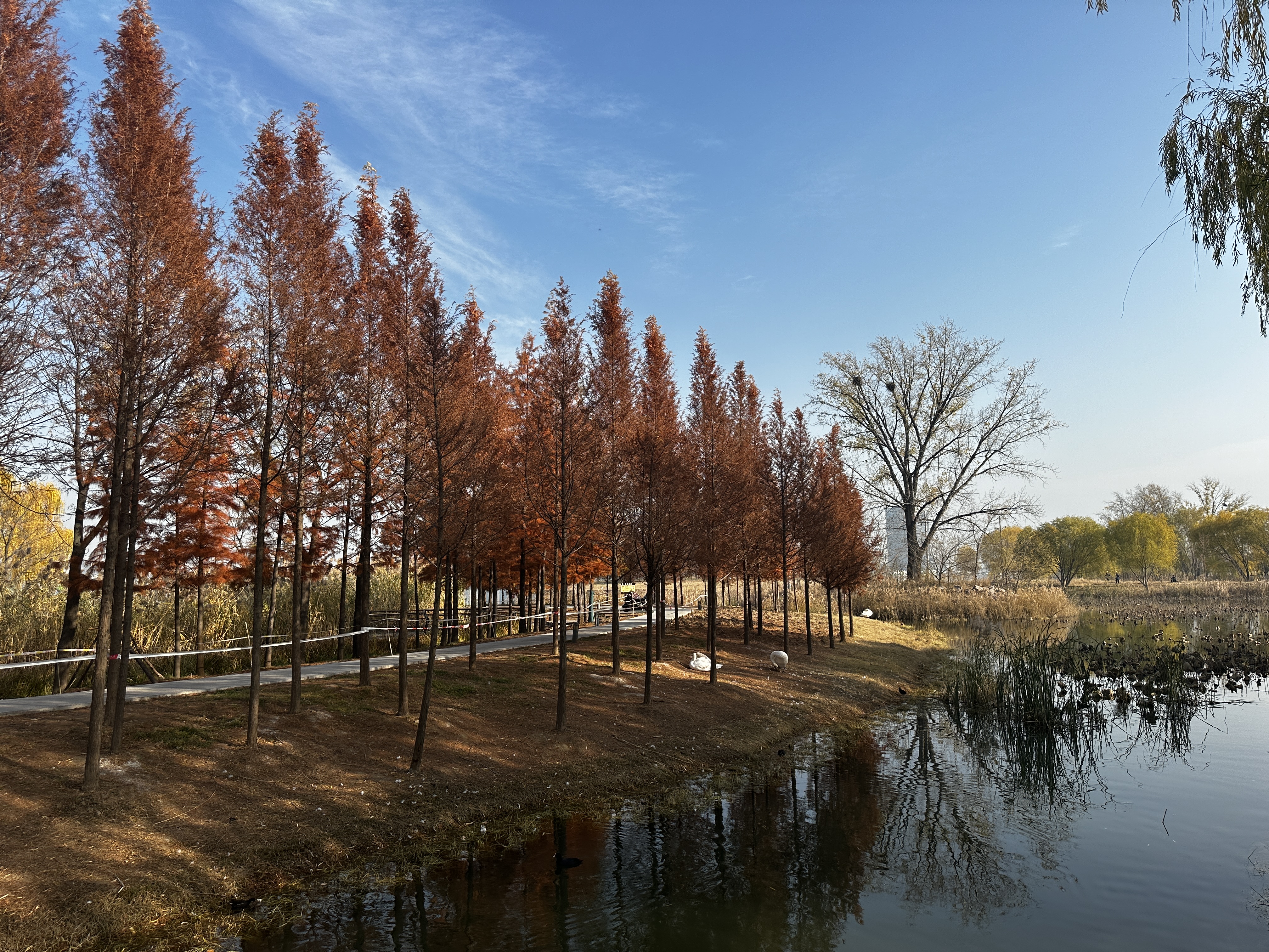 Located in the northeast areas ofZhengzhou, Zhengzhou Longhu Park, with a total area equivalent to the size of23 soccer fields, is currently the largest artificial wetland in Zhengzhou withnatural water ecosystem protection and restoration functions. This area wasonce a barren wasteland but in merely ten years transformed into an inhabitantof nearly 150 species of wildlife such as mute swans, egrets, ducks, andmandarin ducks.