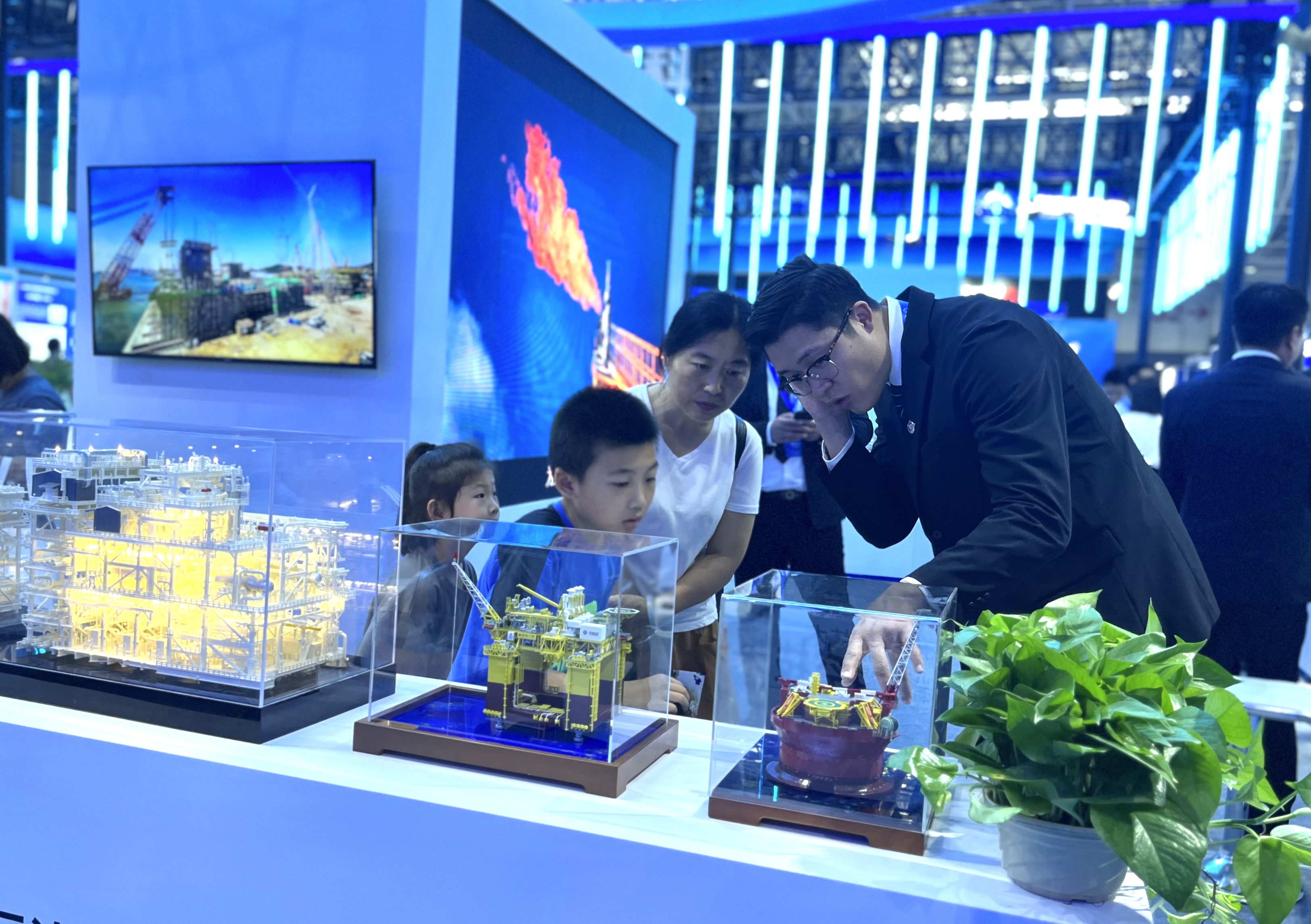 现场展出的“深海一号”、企鹅FPSO等海洋高端装备微缩模型备受关注。宋迎迎 摄