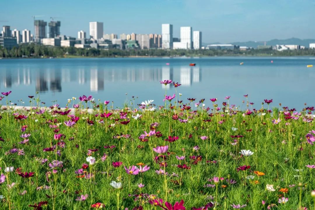 格桑花又称格桑梅朵,花语寓意“幸福”和“美好时光”,花期长达45至60天。空中远望蓝绿交织、水天一色,公园城市大美画卷高屋建瓴,格桑花掩映其中。