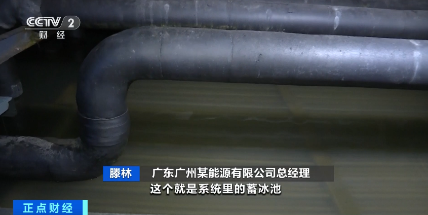 广东广州某能源有限公司总经理滕林表示:“这个就是系统里的蓄冰池,在夜间低谷电价的时候,蓄出来一定量的冰。白天像现在用冷的时间,高温水进来以后,把冰融掉,水温降下去,再通过二次泵送到用户侧,去冷却用户的空调系统。”