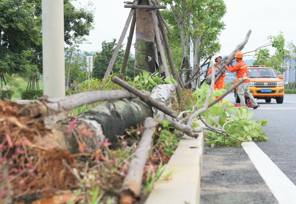 7月28日,工人在位于漳州市龙海区的G228国道一处路段扶正倾倒的行道树。新华社记者 林善传 摄