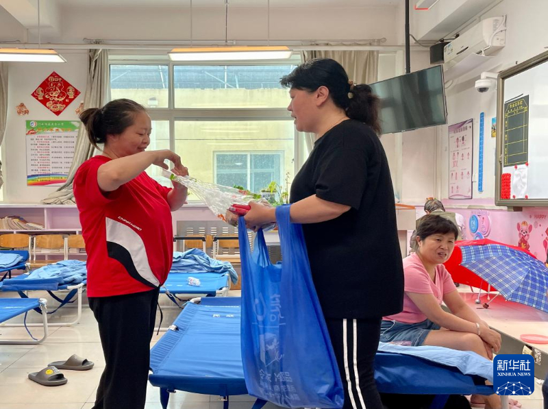 8月1日,在龙泉小学安置点,工作人员为居民发放食品。新华社记者 赵旭 摄