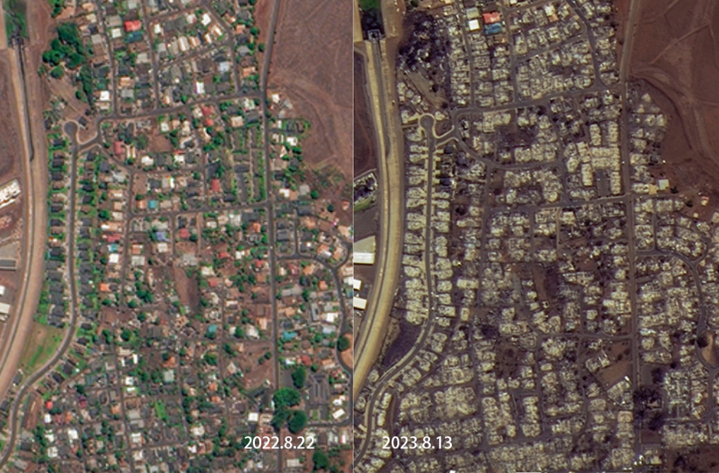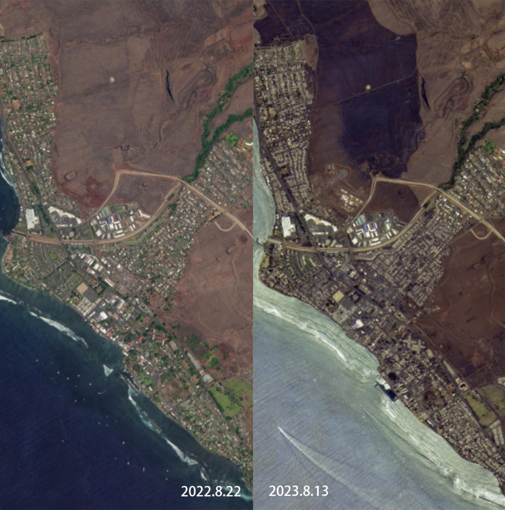 卫星影像对比图显示,夏威夷毛伊县拉海纳小镇海岸边的建筑物几乎都被烧毁,土地烧成了焦黑色。