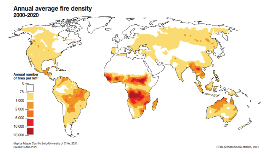 2000-2020年期间全球年平均火灾密度,不同颜色对应每年每平方公里发生火灾的次数。图片来自联合国环境规划署2022年初发布的《野火四处蔓延,威胁日渐逼近》报告。