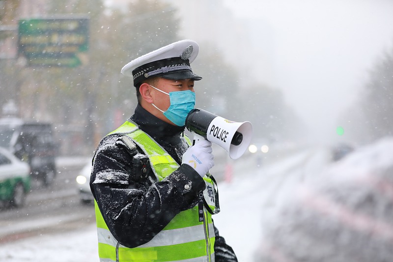 2023年11月6日,辽宁阜新,交警支队以雪为令迅速行动,启动恶劣天气预案,采取措施应对大雪和暴雪的到来。(图片来源:视觉中国)