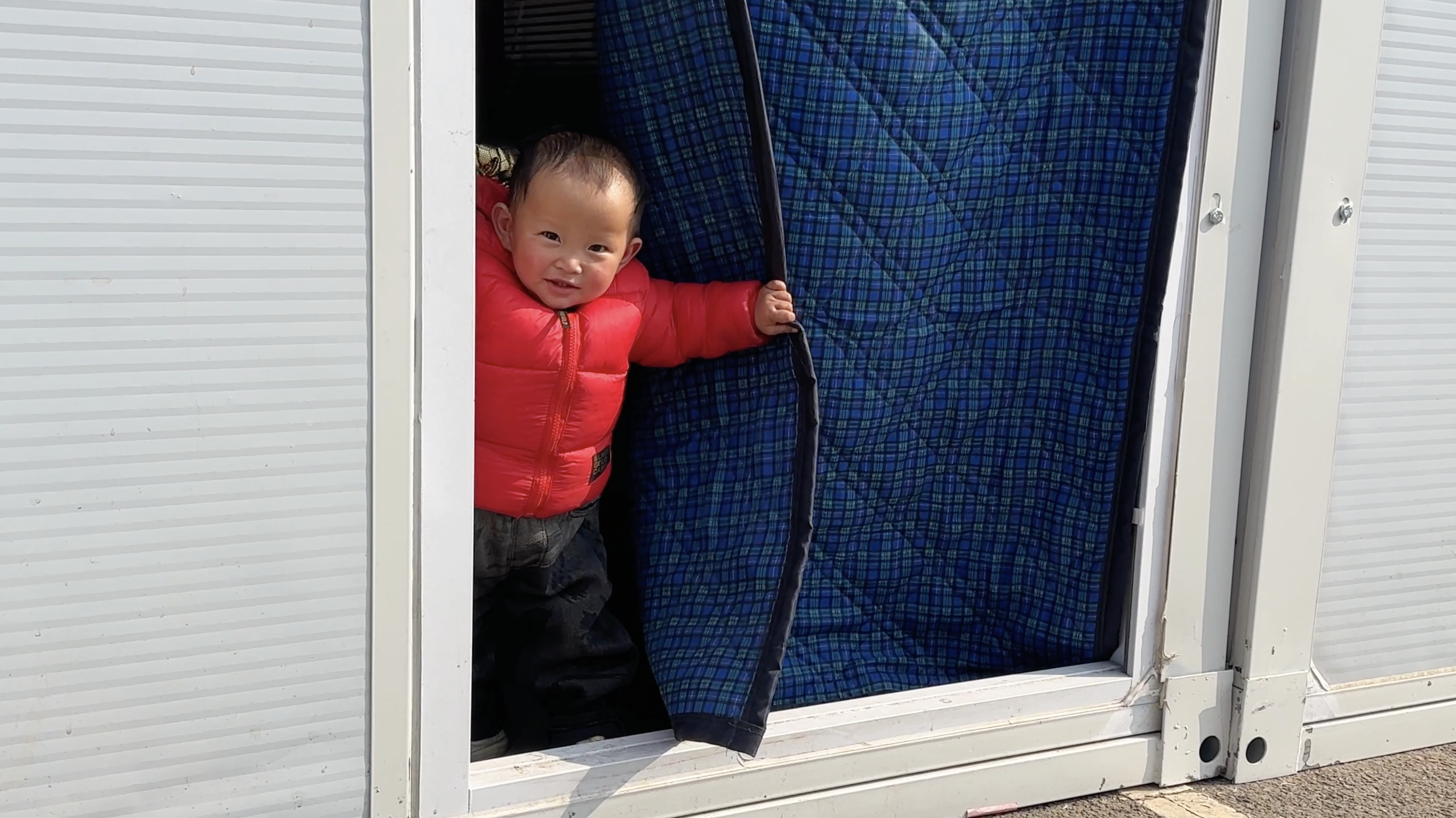 2月10日,喇家村一社安置点内,身着红衣的幼童掀起门帘。李永鹏 摄