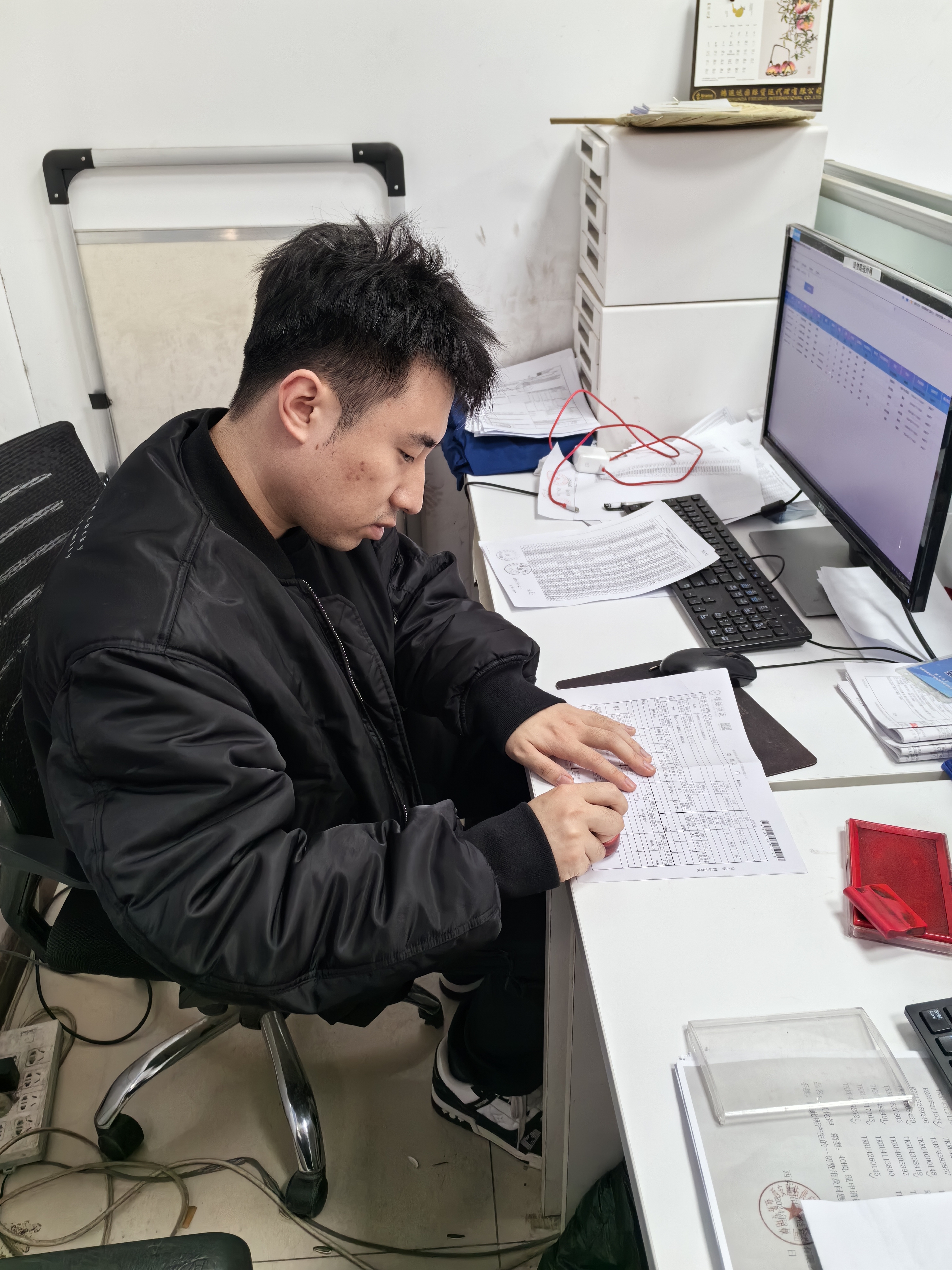 值班人员张恩博正在开箱查验货物。
