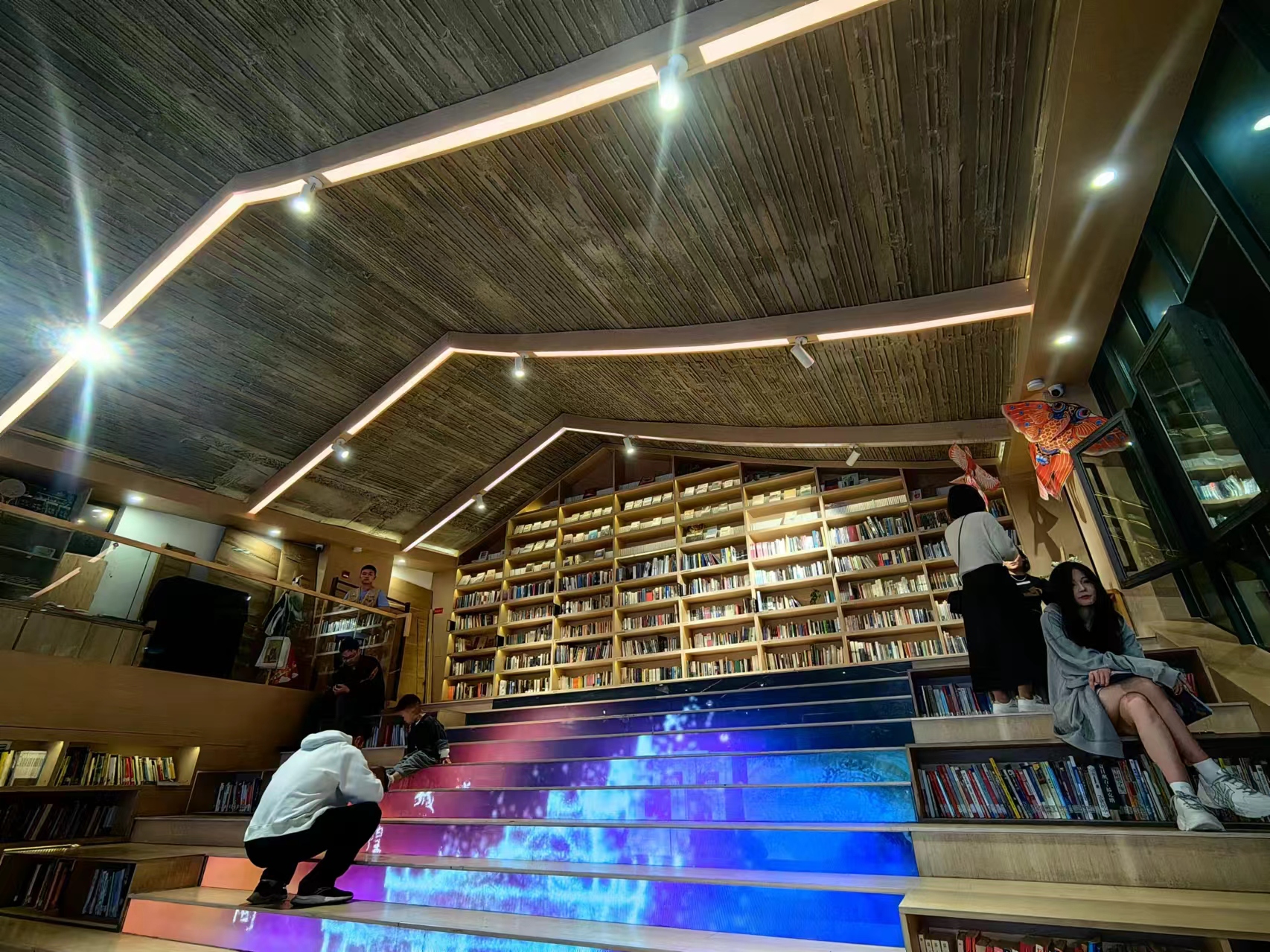 赵群伟提及,南宋书房总面积为约1250平方米,由普利兹克建筑奖获得者王澍设计。建筑包含青砖黑瓦,玻璃幕墙,阶梯状的书架,LED屏幕的楼梯,糅合了宋代和现代元素。这样的设计不仅让书店成为街区亮眼的“网红”,还体现了现代技术对传统的承继和发扬。