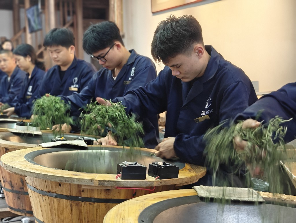4月24日下午,在浙江传统老街——松阳明清古街,一排小年轻端坐在松阳银猴传习馆内,双手不停在上百度高温大铁锅内“出没”。他们不是在练铁砂掌,而是在学习手工炒茶。