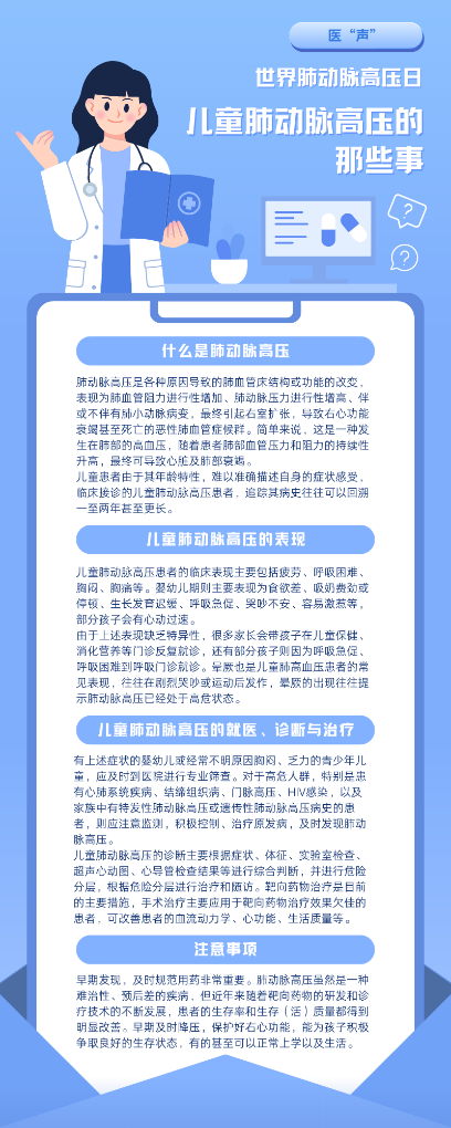 今年的5月5日是第13个世界肺动脉高压日。肺动脉高压患者由于缺氧导致嘴唇呈现蓝紫色,这是其典型表现。但肺动脉高压儿童患者往往临床表现不典型,且儿童难以准确描述自身的症状感受,导致早期难以被诊断,未经规范治疗的儿童肺动脉高压患者,平均生存期仅10个月。专家呼吁,家长应对孩子身体的异常信号提高警惕,及时就医。