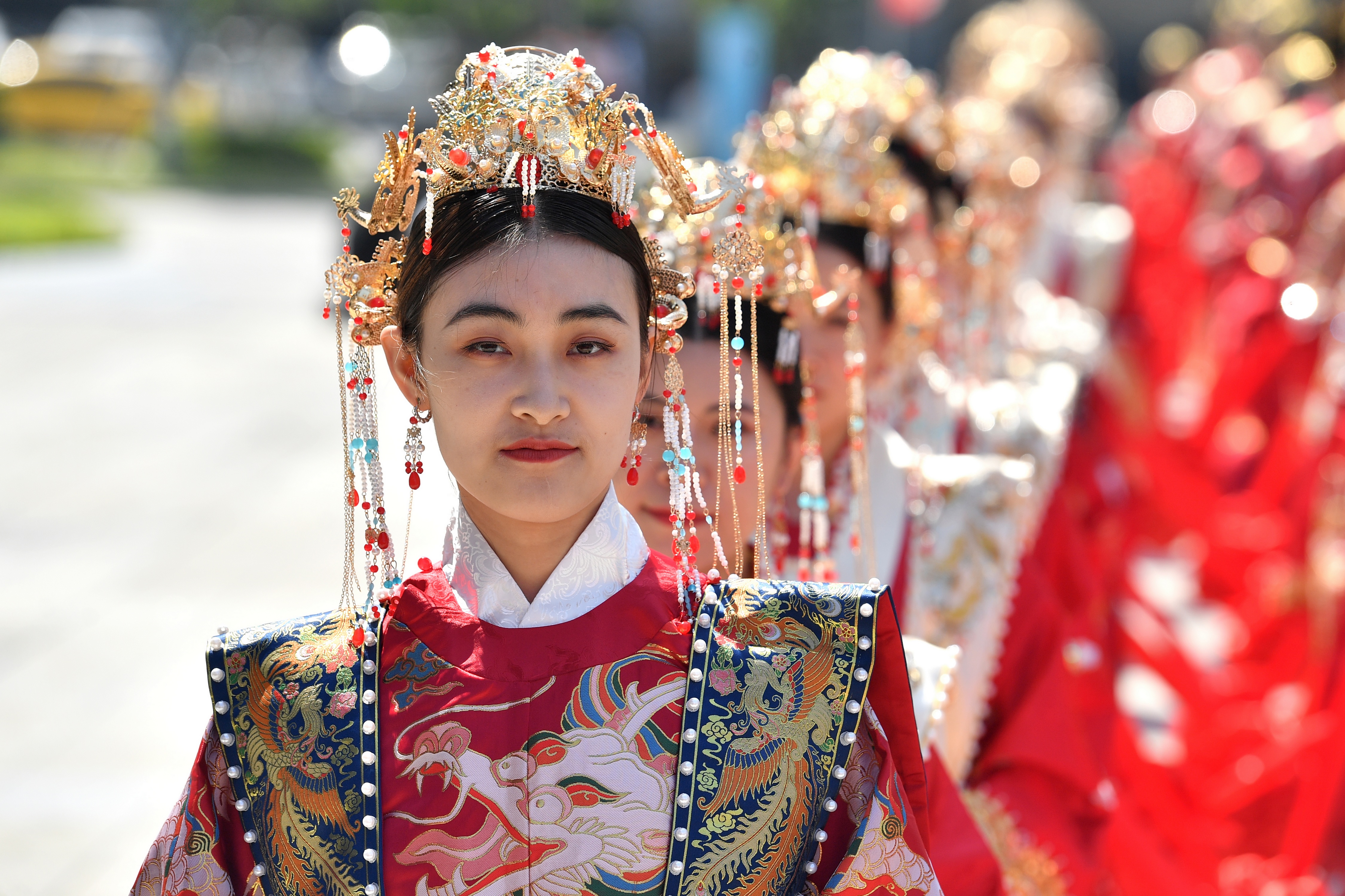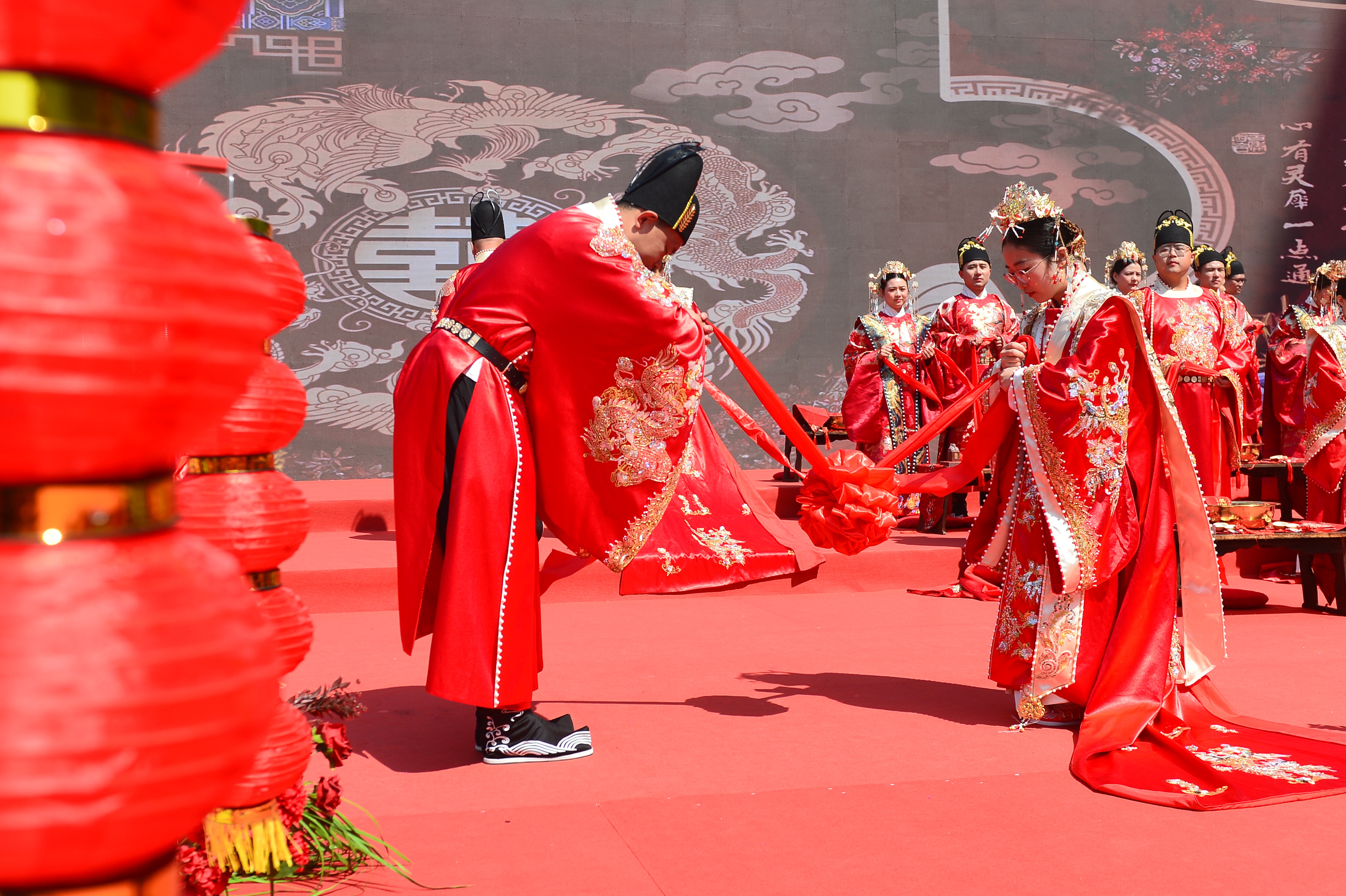 现场,新人们身着传统婚服步入舞台,进行了中式传统婚礼对席、沃盥、合卺、结发、签婚书、执手等仪式。仪式结束后,30对新人及亲友还体验了非遗国潮美学市集,领略传统非遗文化的魅力。