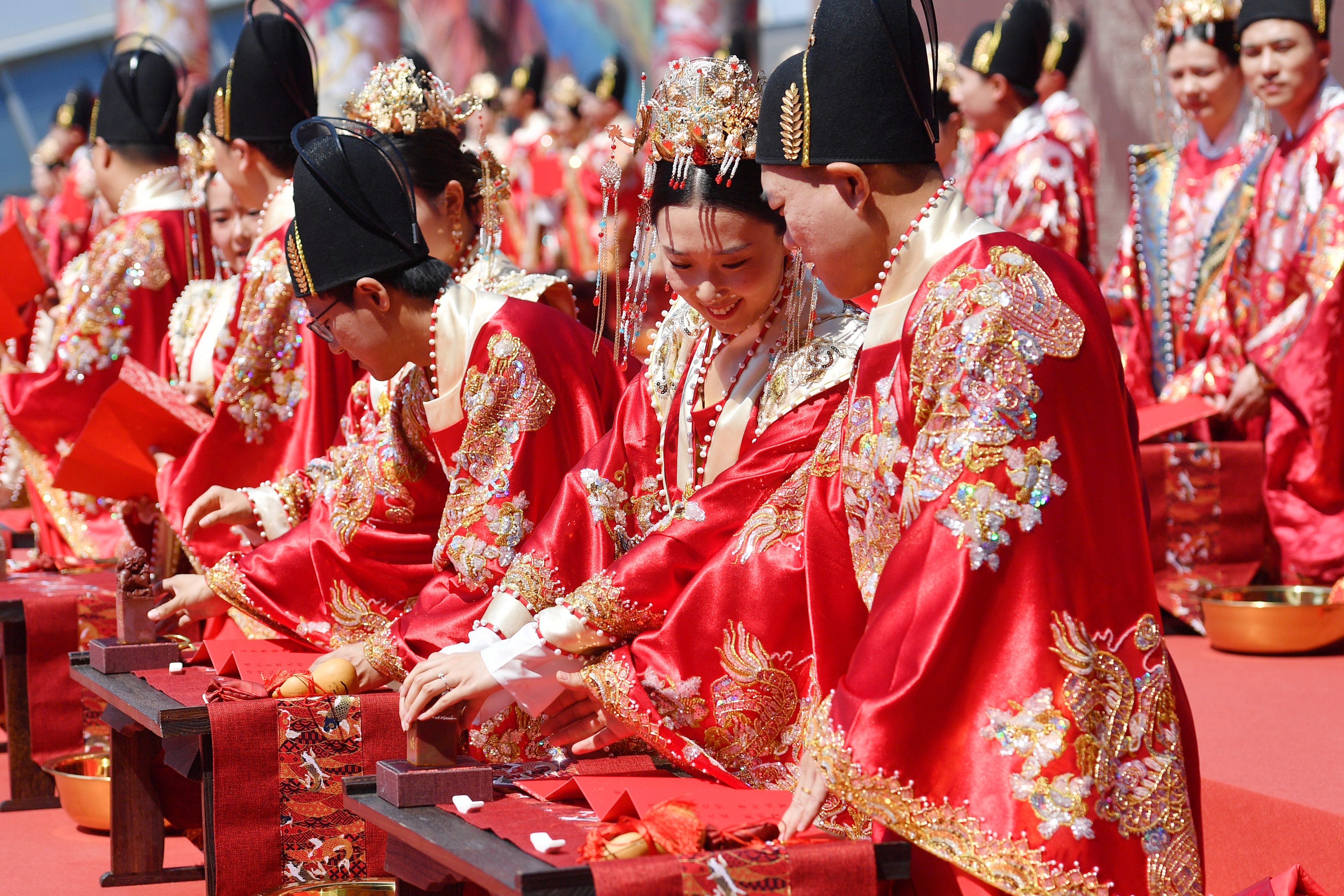 集体婚礼现场,新人携手同签婚书。王海滨 摄