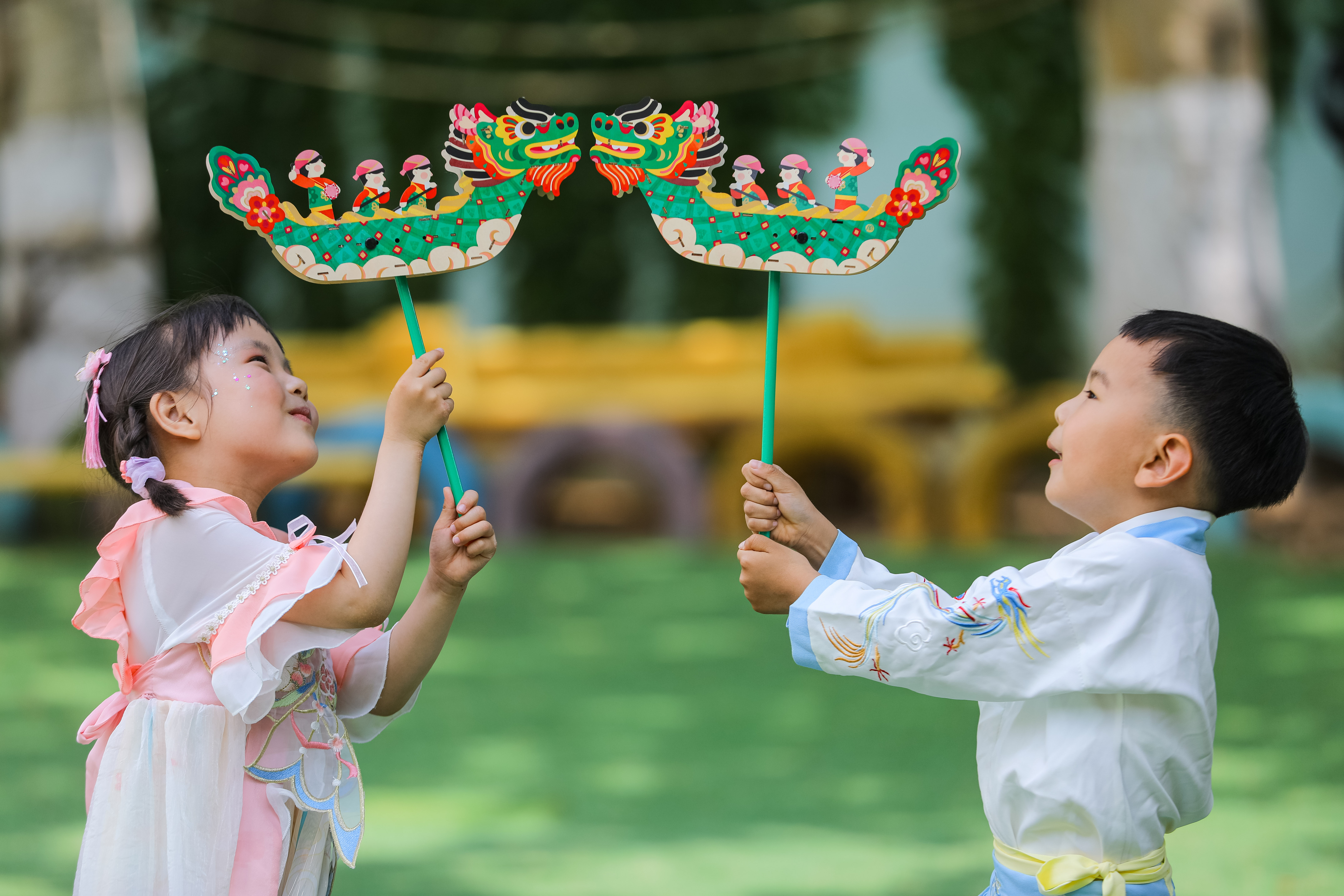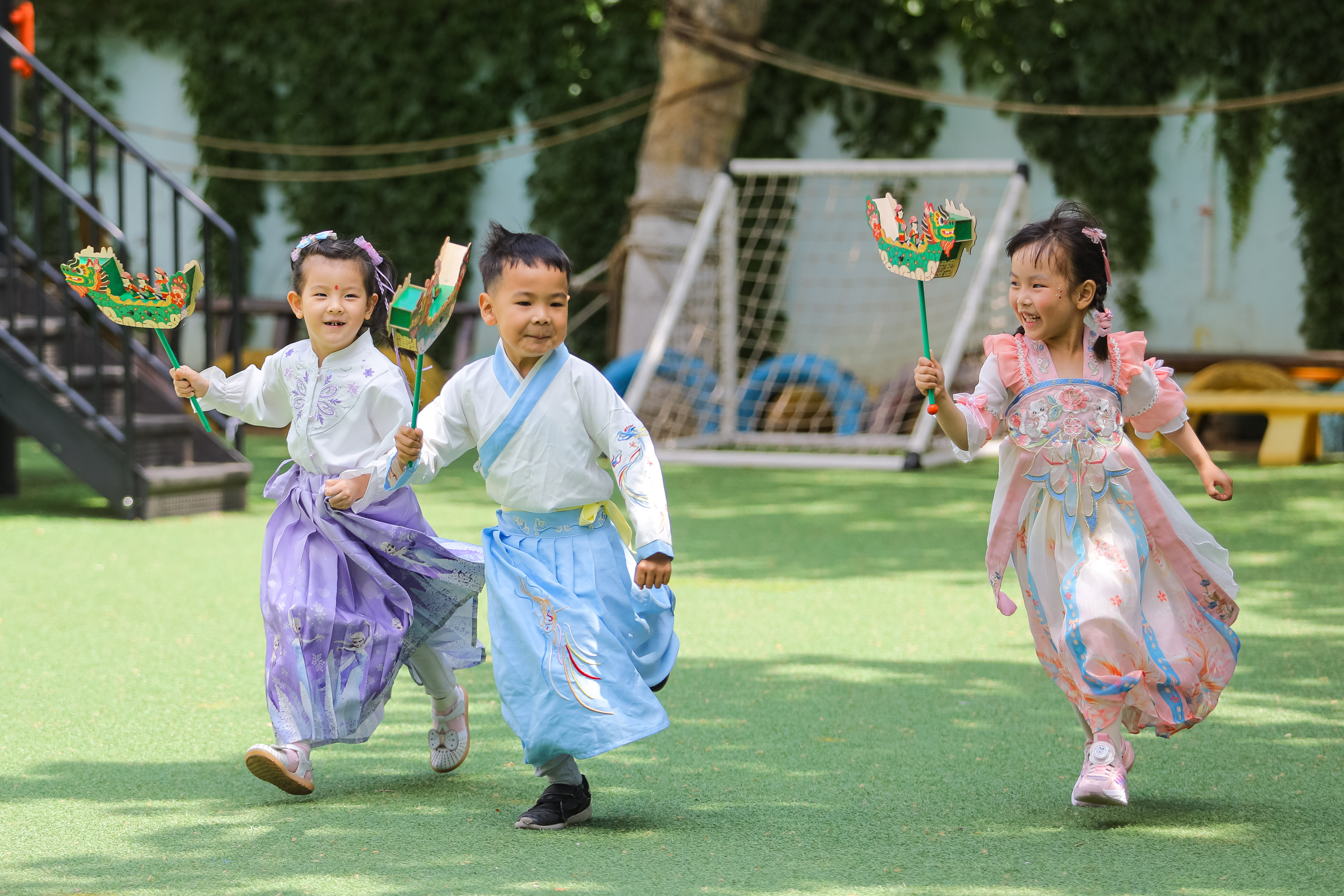 6月6日,在青岛市李沧区青峰路幼儿园,小朋友手持龙舟玩具在操场上玩耍。张鹰 摄