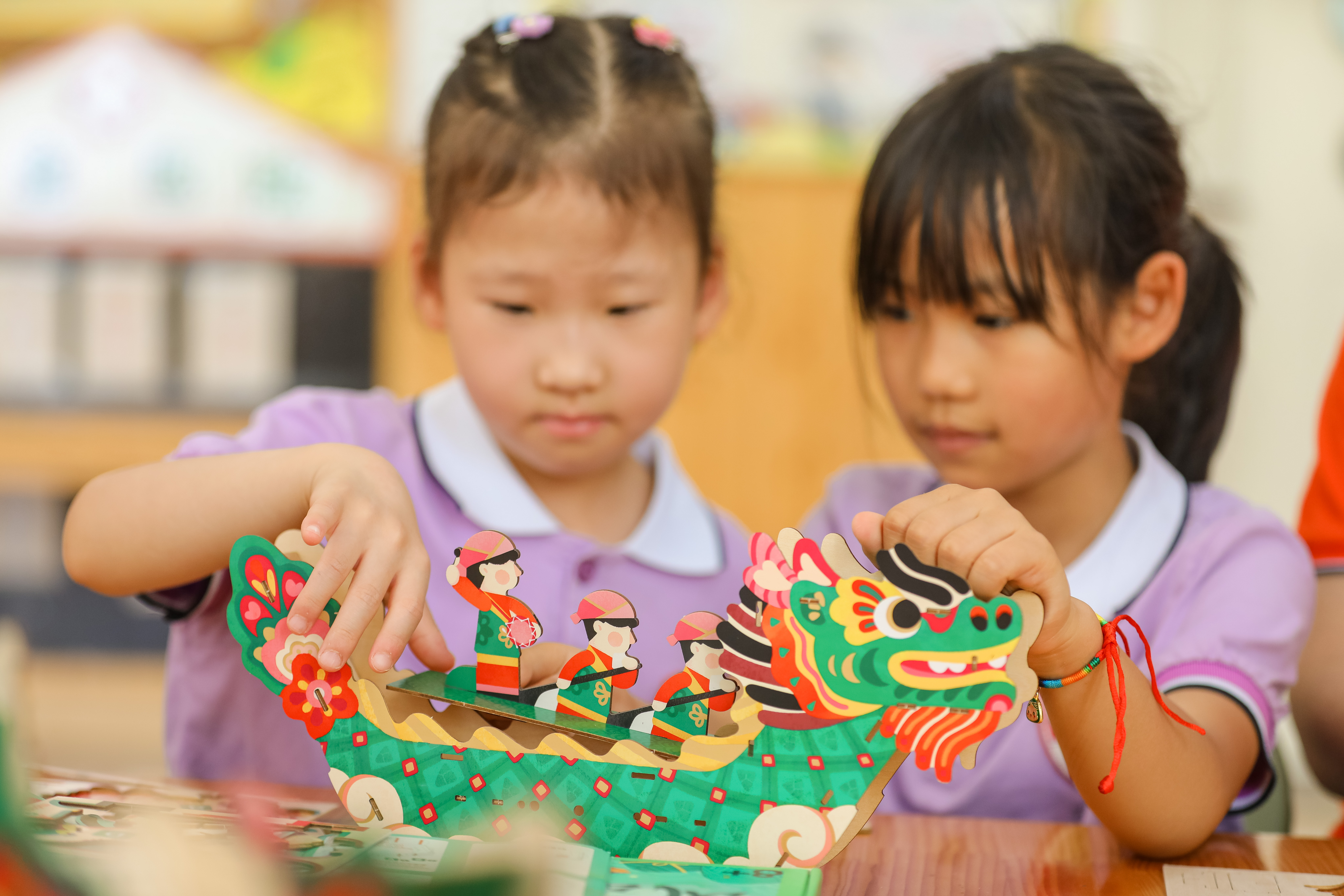 6月6日,在青岛市李沧区青峰路幼儿园,小朋友手工制作龙舟玩具。张鹰 摄