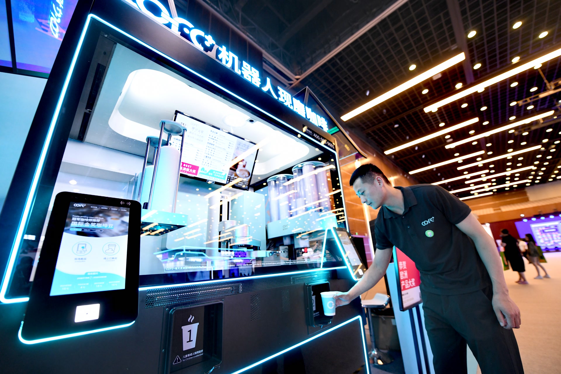 “我们希望借助数字经济大会平台的影响力,寻求更多合作机会。”展位负责人说,目前公司已和北京多家景区洽谈落地合作。7月5日中午,这家公司还将在展馆的发布区现场推介最新款咖啡馆产品。