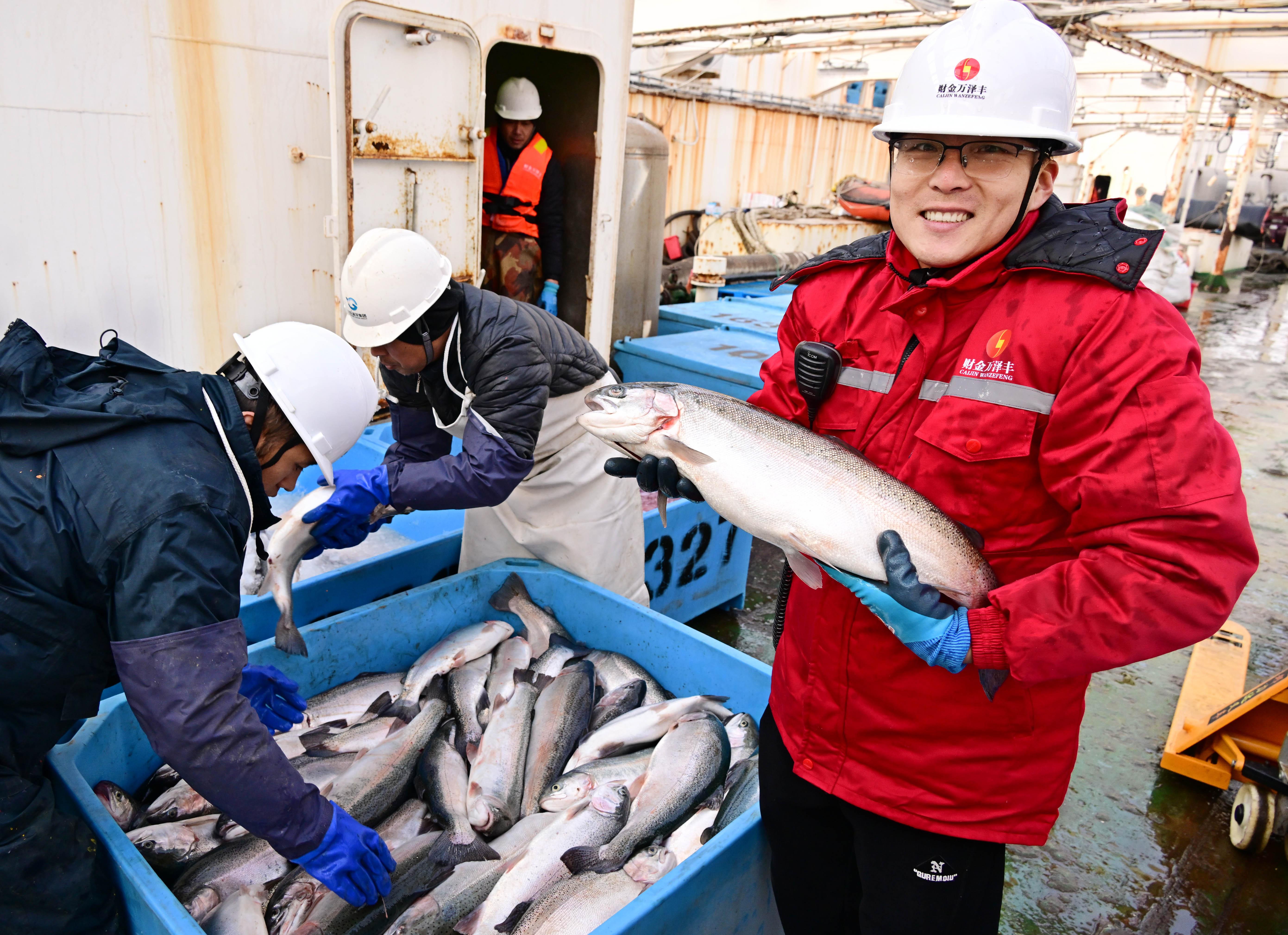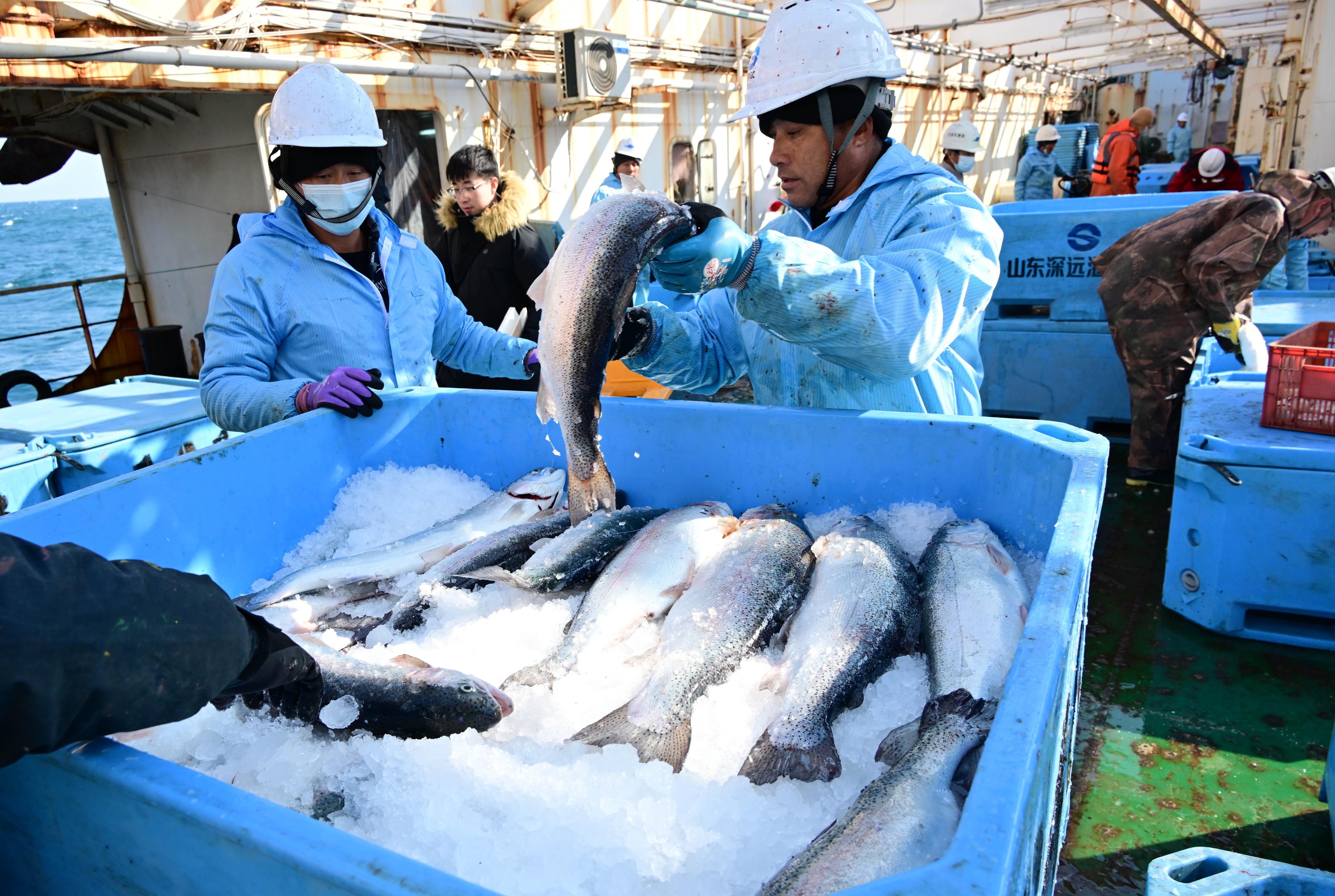 目光下移,直至30米深的冷水团中,身披银白鳞片的三文鱼在“深蓝2号”养殖网箱里穿梭、翻腾。5个月后,它们将被送往天南海北,端上千家万户的餐桌。
