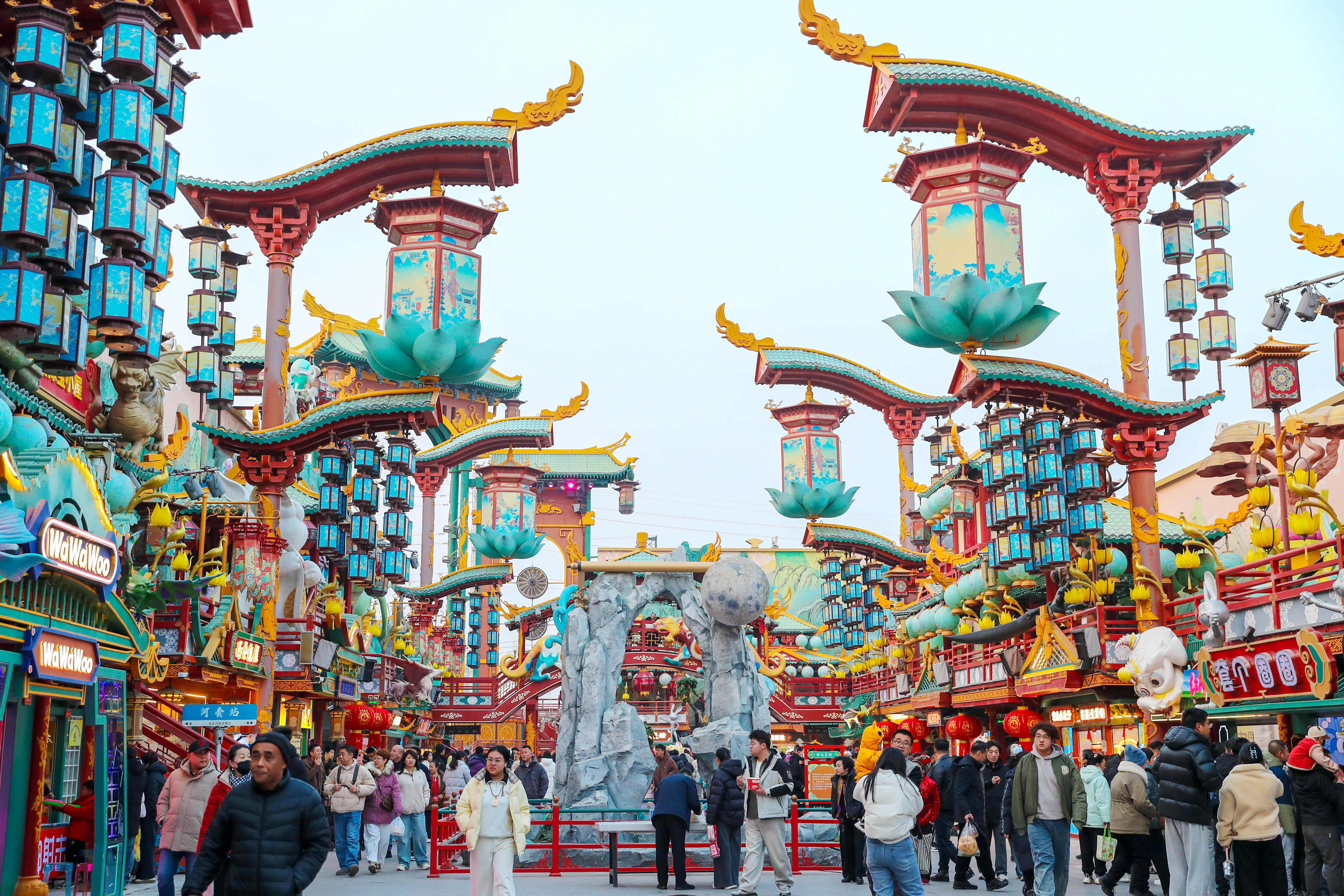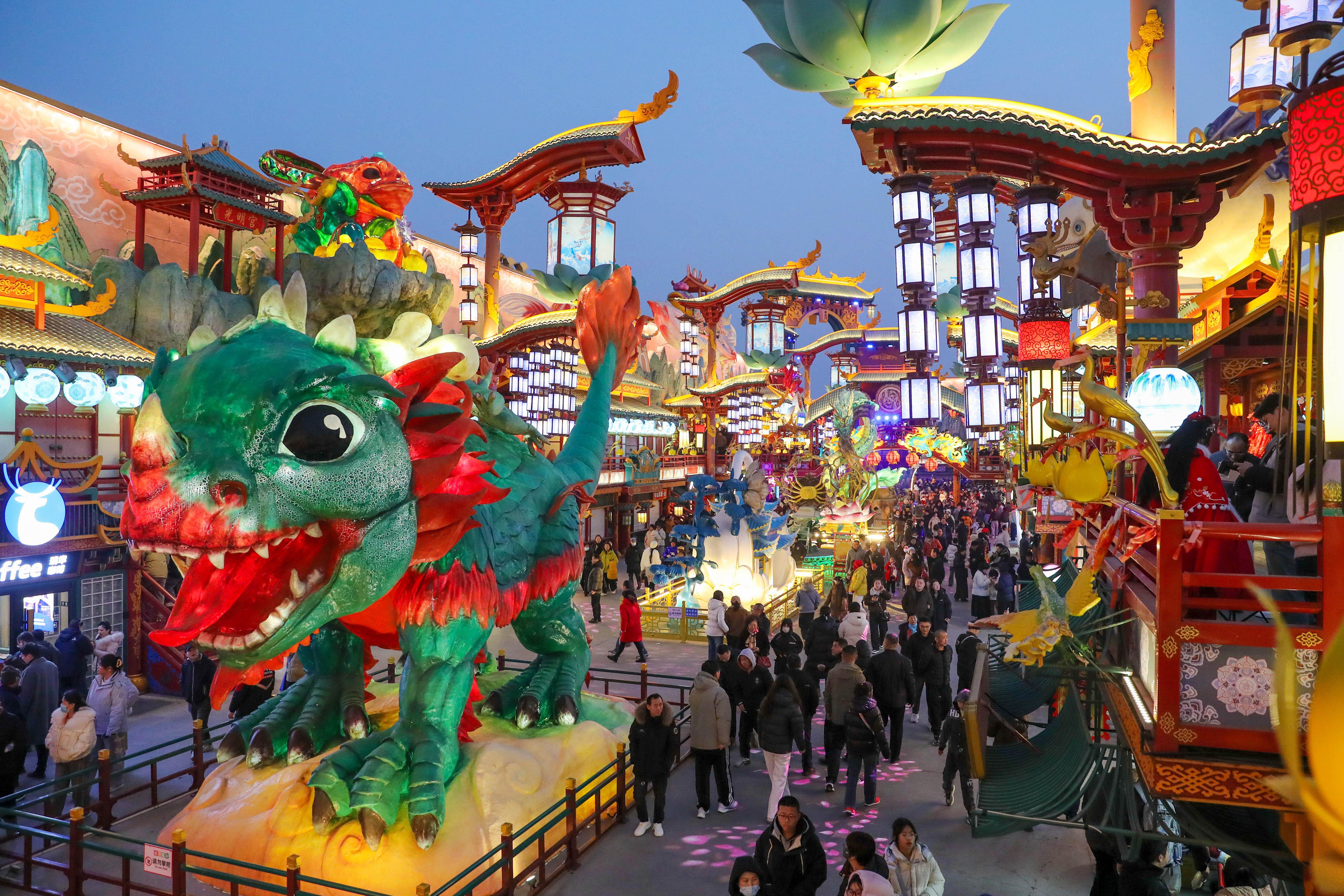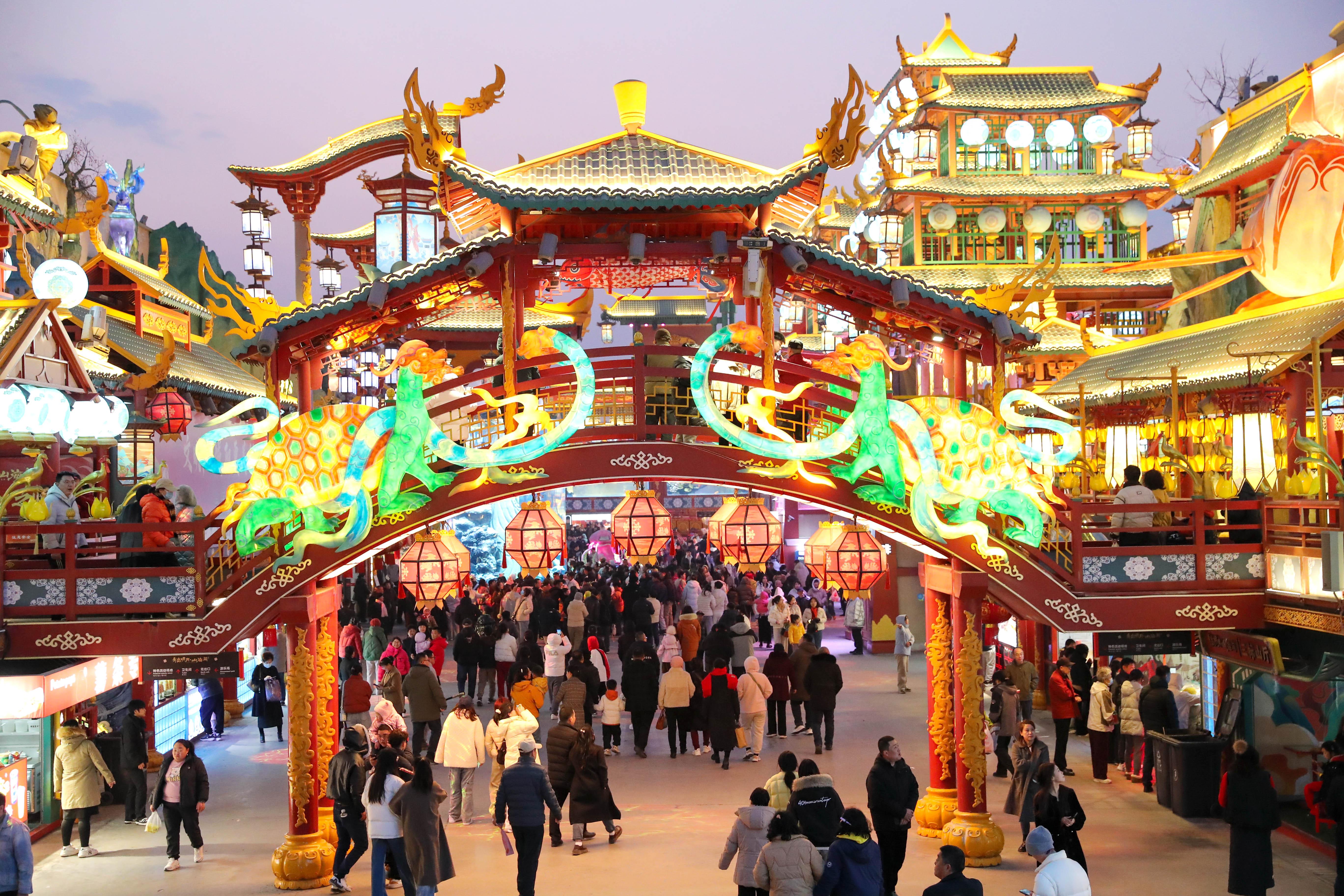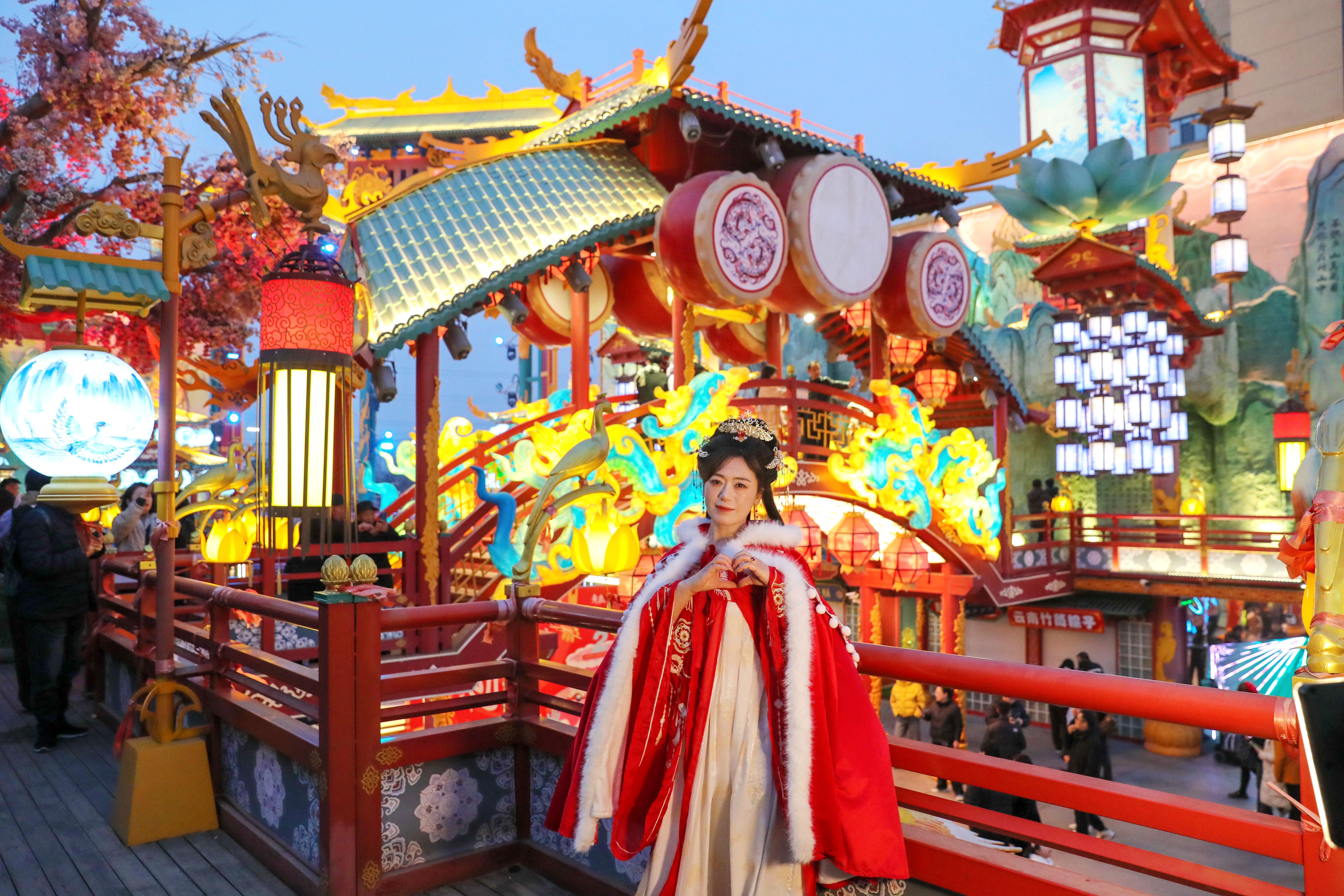 2月19日,位于青岛市城阳区的明月·山海间不夜城主题街区华灯璀璨、人流如织。当地积极落实惠民举措,推出非遗表演等特色文旅活动,吸引游客前来打卡游玩、乐享新春,助力假日文旅消费市场持续升温。
