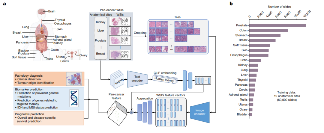 研究人员将新模型命名为CHIEF,是“临床组织病理学成像评估基础”之意。它首先要用1500万张未标记图像进行训练,然后,再基于6万张全切片图像进行进一步训练,样本包括肺部、胃部、结肠、大脑、肝脏、胰腺和肾上腺皮质等19种组织。通过训练模型查看图像的特定部分和整个图像,它能将一个区域的变化与整体背景联系起来。
