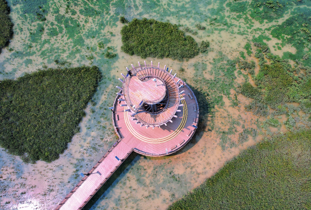 站上观景台,从空中俯瞰下潭尾红树林公园,一组由红树林勾勒出的爱心和五星图案在碧波荡漾的海面上延展开来。这是厦门大学环境与生态学院教授卢昌义团队设计培育的地标景观,生动体现出红树林品种的多样性。