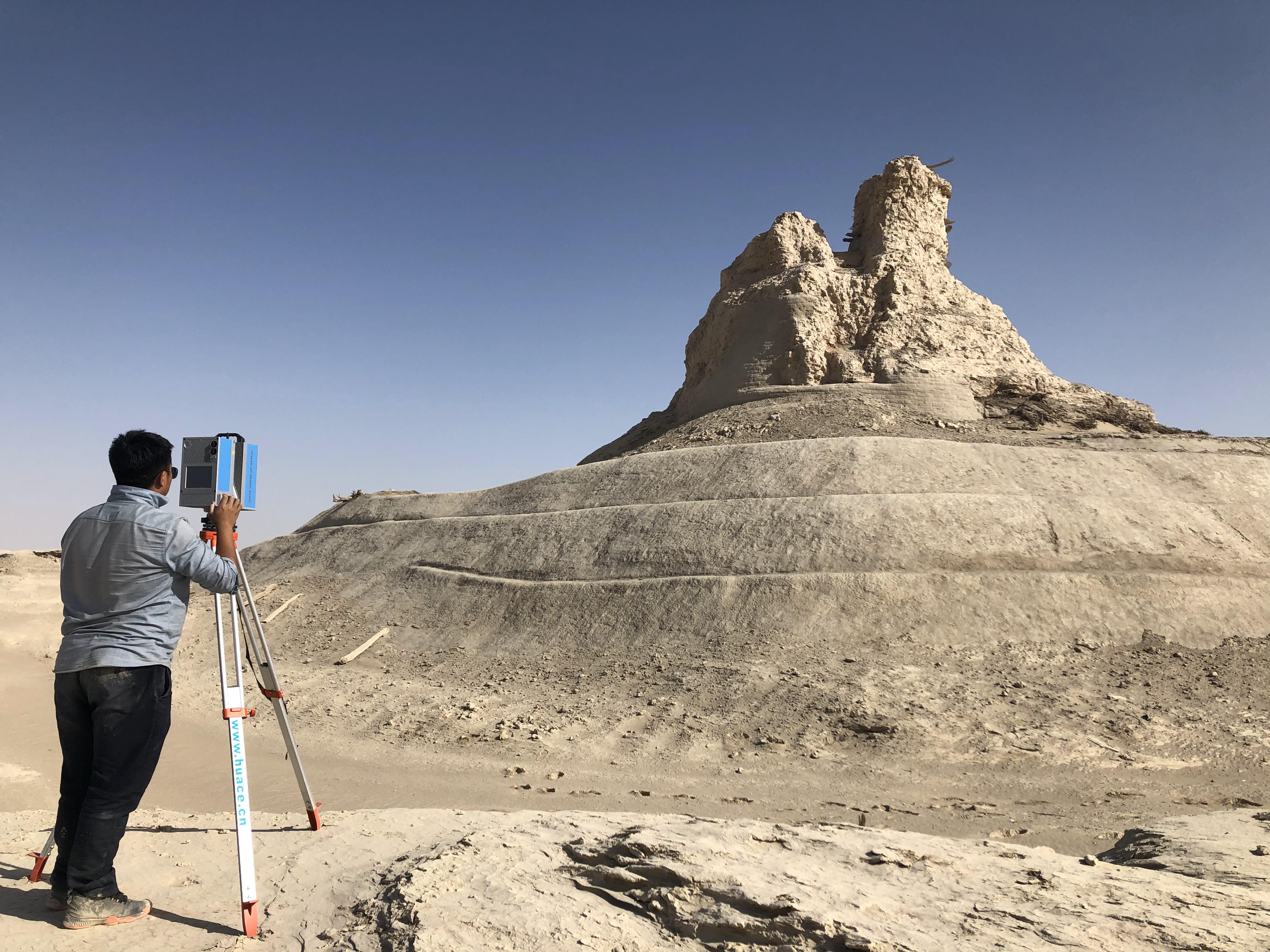 中铁文保技术员在对楼兰古城佛塔遗址进行数据采集